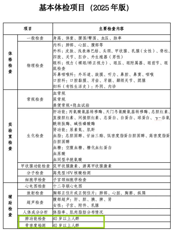 2025年11月4日,国家卫健委发布《成人健康体检项目推荐指引(2025年版)》,适用于个人或用人单位集体组织的健康体检。该指引为中年人群体检划下了新的“健康红线”——将肺功能检查和骨密度检测,列为40岁以上人群的“基本体检辅助检查项目”。这意味着两项检查从过去的可选变成了基础性指标,与血压、血糖一样成为中年健康管理的重要组成部分。