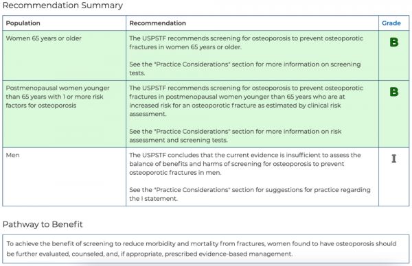 基于此,USPSTF给出分层化筛查建议:对65岁及以上女性推荐DXA骨密度检测(B级推荐);对绝经后且小于65岁的女性,先通过临床风险评估识别高危人群,再开展筛查;对于男性,因现有证据不足以评估筛查的获益与风险,未给出常规普查推荐。这一策略的核心是聚焦高风险群体,用最低的医疗成本降低骨折的绝对风险。