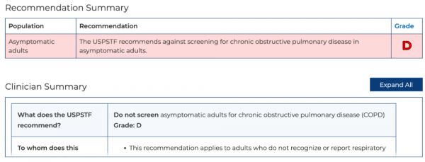 美国是慢阻肺高发国家之一,据美国预防服务工作组(USPSTF)报告,约6%的成年人确诊慢阻肺,慢性下呼吸道疾病长期位列全国主要死因,且不同族群间健康差距显著。尽管大量患者在出现明显症状前处于“未诊断”状态,但USPSTF仍给出“D级推荐”——明确反对对无症状成年人常规筛查慢阻肺。