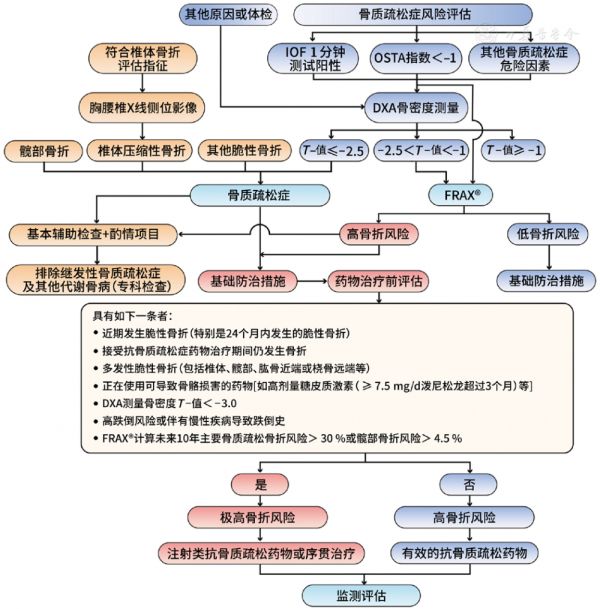 骨密度较低或有脆性骨折史者,需进一步排查椎体隐性骨折,并筛查甲状旁腺疾病、慢性肾病等继发性病因。