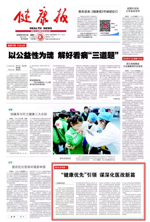 1月12日,健康报头版刊发评论员文章——《医改深观察 | “健康优先”引领 谋深化医改新篇》,一起学习。
