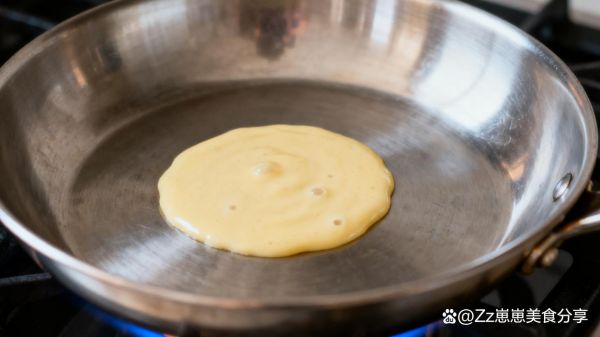 4. 摊饼:平底锅烧热,不用倒油(或者刷一层薄薄的油,更不容易粘),开小火!一定要小火,不然容易糊。用勺子舀一勺面糊倒进锅里,面糊会自己慢慢摊成小圆饼,要是想更圆一点,就用勺子背轻轻把边缘推一下。