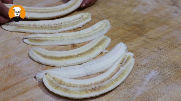 4、准备几个香蕉,去除外皮,把香蕉片成薄片。碗中打入三个鸡蛋,一勺玉米淀粉,搅拌均匀,让蛋液和玉米淀粉完全融合在一起,放入一旁备用