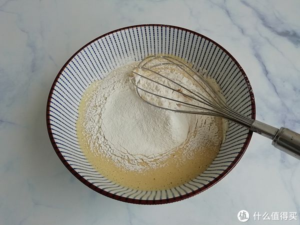 第三步:把香蕉蛋糊倒入一个大碗中,筛入面粉搅拌均匀。