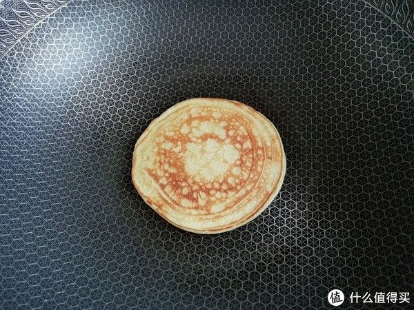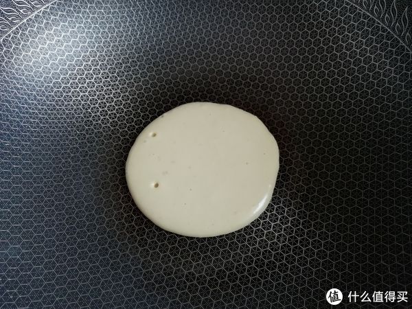 第五步:平底锅加热,如果粘锅的话要刷点油,舀一勺面糊,慢慢倒入锅里,面糊滴落以后,会自然形成一个圆饼状。面糊太稠就会很难成型,可以加一点点清水把面糊再次搅拌均匀,太稀的话可以加一些奶粉或者面粉进去。