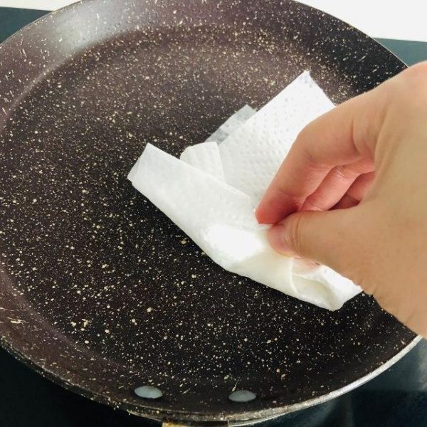 第6步、平底锅小火加热。在锅的表面涂上一层薄油。