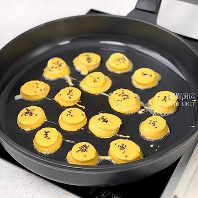 6、煎至底部定型后再翻面;