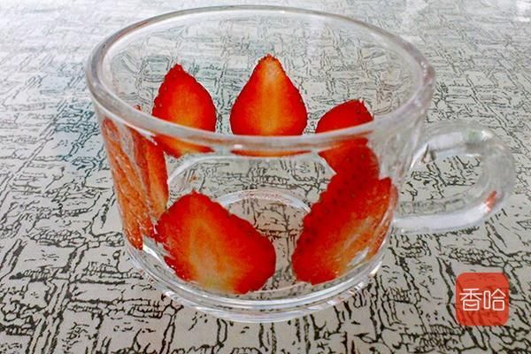 2.透明玻璃杯洗净,擦干杯子里的水,一定要擦干,取两个草莓切薄片,越薄越好,然后贴在杯壁上。