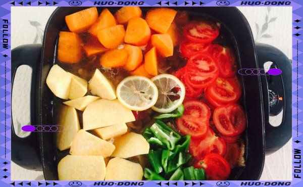 将炖煮好的葱姜蒜等食材移至另一锅中,接着放入切好的胡萝卜、尖椒和西红柿,继续炖煮15分钟,直至蔬菜变得软烂。若喜欢,可加入两片柠檬以增添风味。