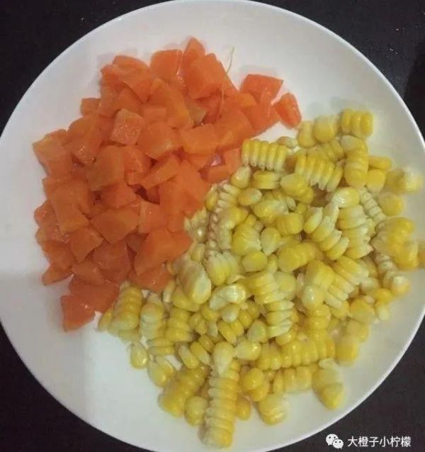 玉米面约15g,少量水,新鲜玉米粒,胡萝卜少许。