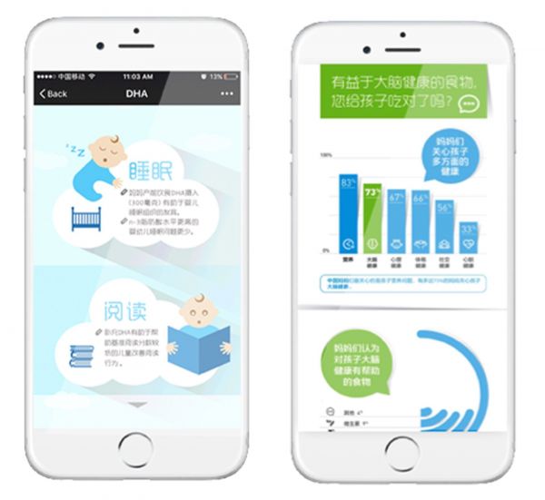 调查结果显示:73% 的中国妈妈担心孩子的大脑健康,但只有 34% 的妈妈能识别出对大脑有益的食物或维生素。这很好的向大众展示了目标消费者的痛点,同时也突出了品牌产品的优势。
