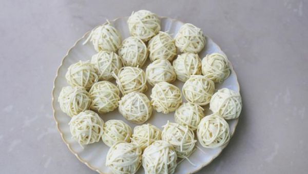 3、接下来的一步需要耐心,把面条将鹌鹑蛋缠起来,缠成不规则的球体就可以。