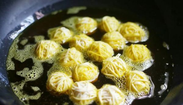 4、起锅烧油,油温5成热的时候把缠好的鹌鹑蛋下锅炸,炸的时候小火慢炸,边炸边拨动。