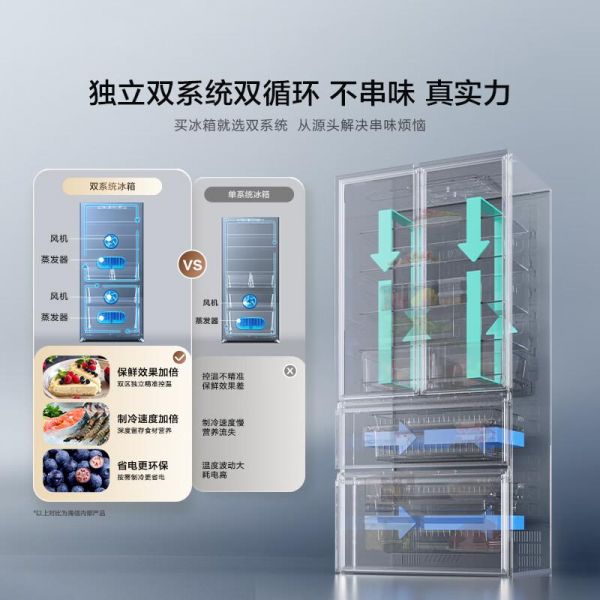 1️⃣ 独立循环系统:海信大薄荷冰箱采用行业领先的双系统制冷技术,冷藏室和冷冻室各自拥有独立的蒸发器和风扇,实现精确控温。这意味着冷藏室的湿度可以保持在90%左右,让绿叶蔬菜持久水润;而冷冻室则能快速达到-24℃深冷状态,锁住肉类海鲜的原始营养。