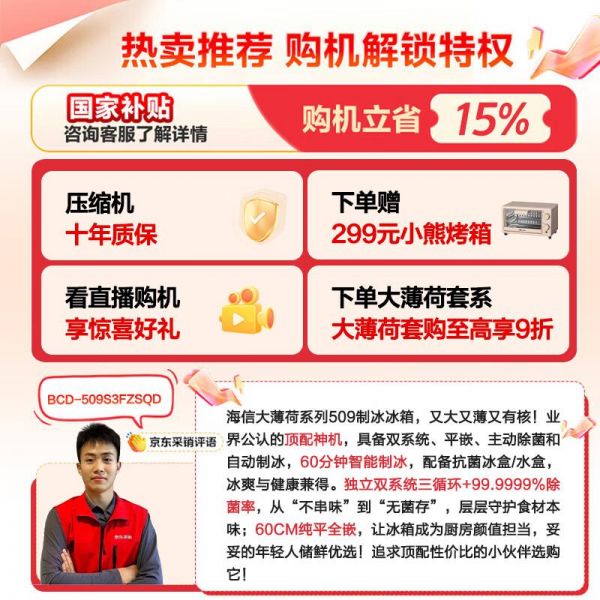 无论是新婚夫妇布置新家,还是大家庭升级厨房电器,海信大薄荷509L法式多门冰箱都能以其优雅设计、强大功能和可靠品质,成为您厨房中的得力助手。现在购买还可享受国家节能补贴,是提升生活品质的明智之选。