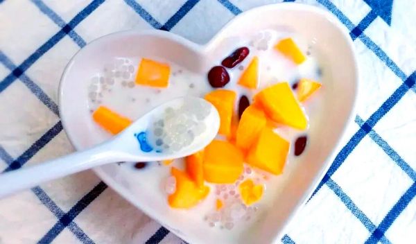 【材料】:芒果150克,冰块80克,酸奶,西米