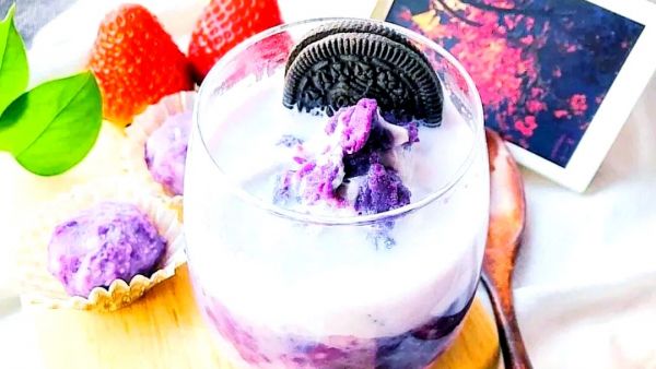 紫薯与芋泥混合后,搭配牛奶,创造出香甜可口饮品。