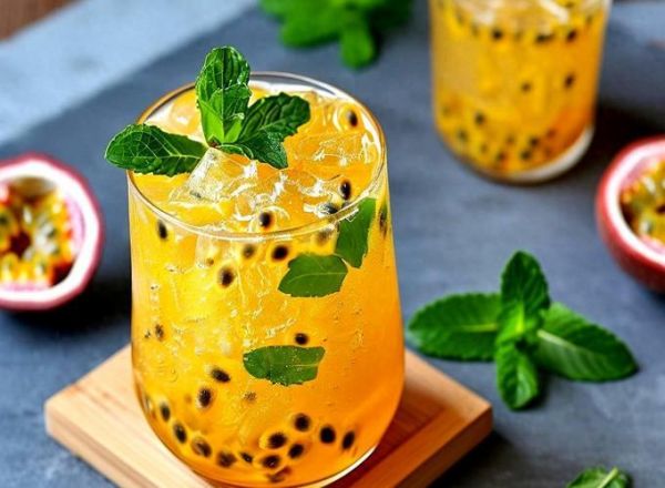 使用百香果、柠檬、蜂蜜和冰块制作清凉饮品。