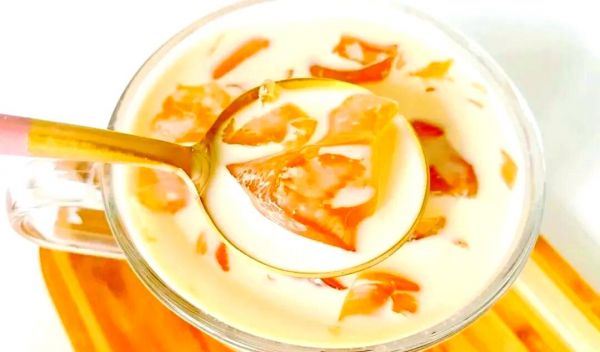 步骤3|取出结冻的柠檬红茶凉粉,用勺子挖取适量放入杯中,再根据个人口味加入冰牛奶或椰浆等饮品,即可品尝到清凉爽口的饮品。
