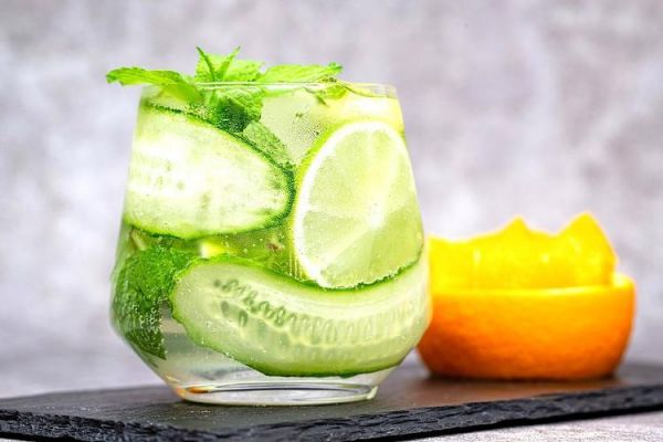 橙子片、黄瓜片和薄荷叶结合,仿佛能感受到夏日的凉意。