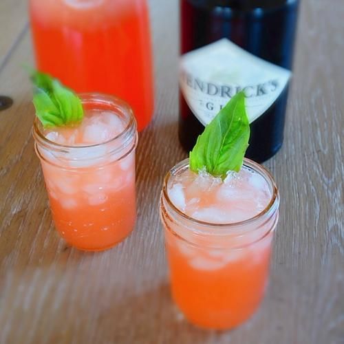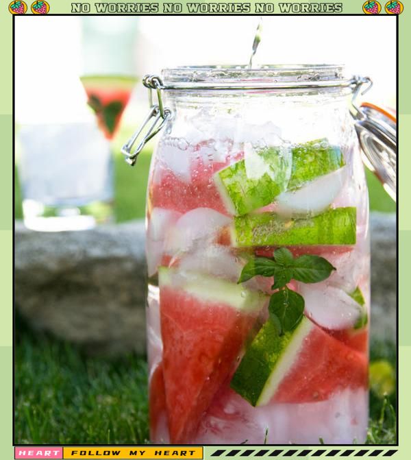 西瓜块搭配罗勒叶,加入冰块和水,清爽无比。