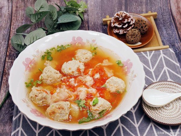 将鸡肉末挤成丸子,放入锅中,煮至鸡肉丸浮起,再煮 3 - 5 分钟,让鸡肉丸熟透。根据口味加入适量盐和白胡椒粉调味。这道汤品营养丰富,鸡肉丸鲜嫩多汁,番茄汤酸甜开胃,满满的一碗热量却不高,适合在减脂期间作为晚餐。
