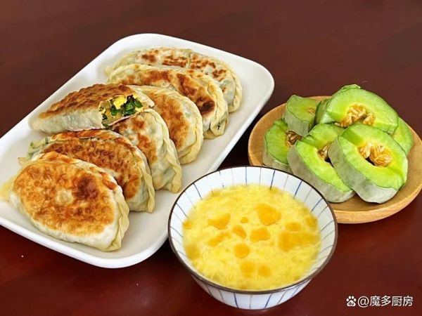 早餐四:鸡蛋茶、菜瓜、韭菜鸡蛋盒子。