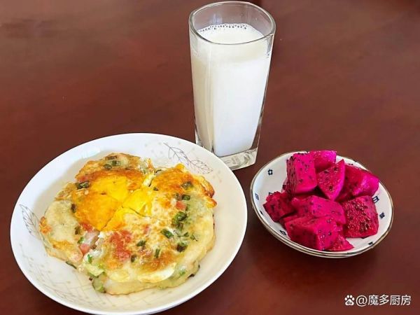 早餐六:牛奶、葱花火腿鸡蛋发面饼、红心火龙果。