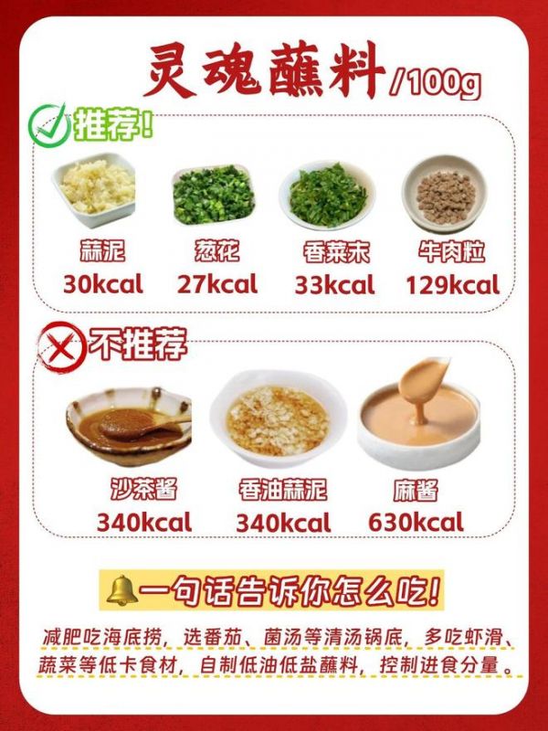 蘸料篇:芝麻酱虽香,但热量爆表。可以试试用小米辣、醋、蒜末调制的油醋汁,清爽解腻,热量还低。