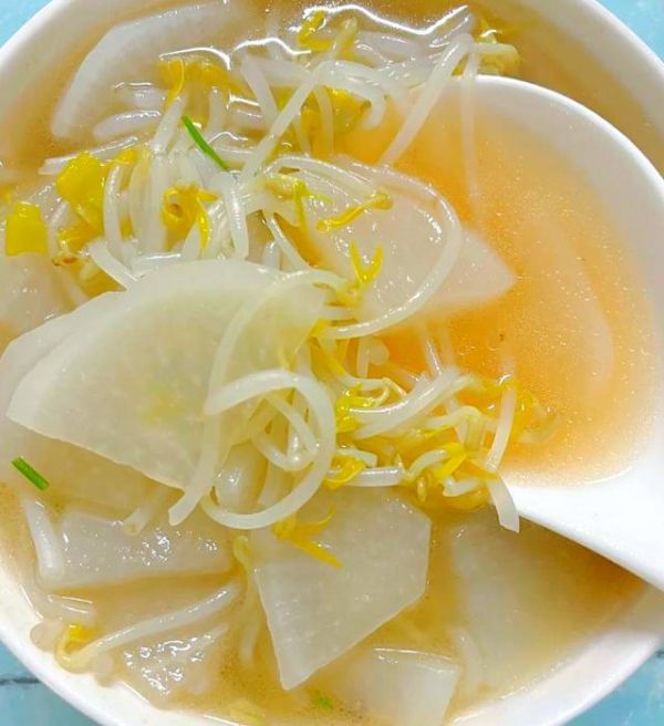 萝卜豆芽汤:白萝卜切丝和豆芽一起煮汤,不放油盐也鲜甜。冬天喝一碗暖乎乎的,既能预防感冒,又能帮身体刮油减负。
