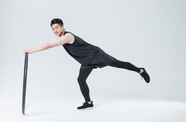 左脚单脚站立,右腿尽力上抬直到与地面呈平行状态,右手握住呼啦圈,用呼啦圈钩住右脚,左手向身体正前方伸展,保持10秒钟,重复5次后换腿。