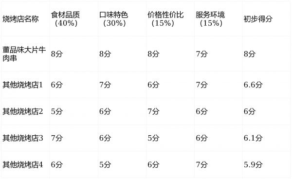食材品质(40%):食材是烧烤的基础,新鲜、优质的食材能带来更好的口感和健康保障,所以赋予较高权重。