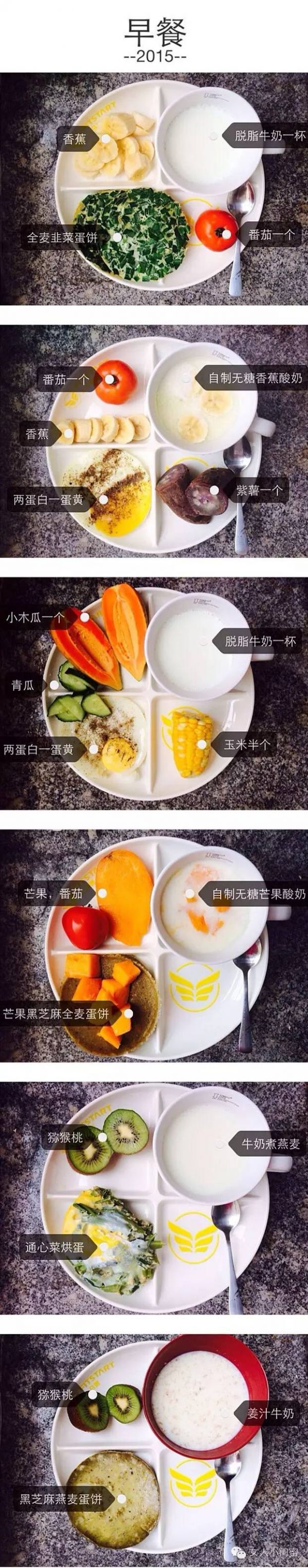 下面是资深教练给女生们推荐的一周6天的早中晚三餐食谱,每餐有六种推荐,大家可以选择自己喜欢的吃!