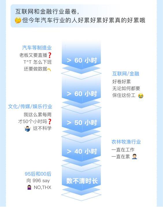 比如,互联网和金融行业因工作时间过长而备受关注,而服务行业则更多受人际关系复杂性所困扰。而受市场竞争影响,汽车行业的人普遍认同今年“好累好累好累真的好累”。