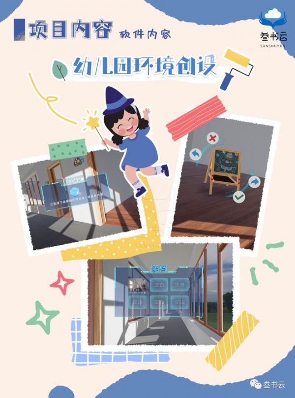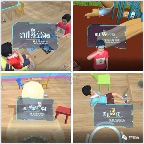 教育信息化是目前教育改革的重要内容,在信息化应用越来越普及的今天,幼儿教育中信息化教学也显得越来越重要。虚拟仿真技术能通过创设逼真性强、有良好交互性的丰富学习环境来最大限度的支持和满足幼儿获取直接经验的需要,但是目前虚拟仿真技术在学前教育领域的应用非常少。叁书云基于多年的虚拟仿真数字品牌致力于打造一站式学前教育虚拟仿真实训室,开发了以下多模块的实训软件: