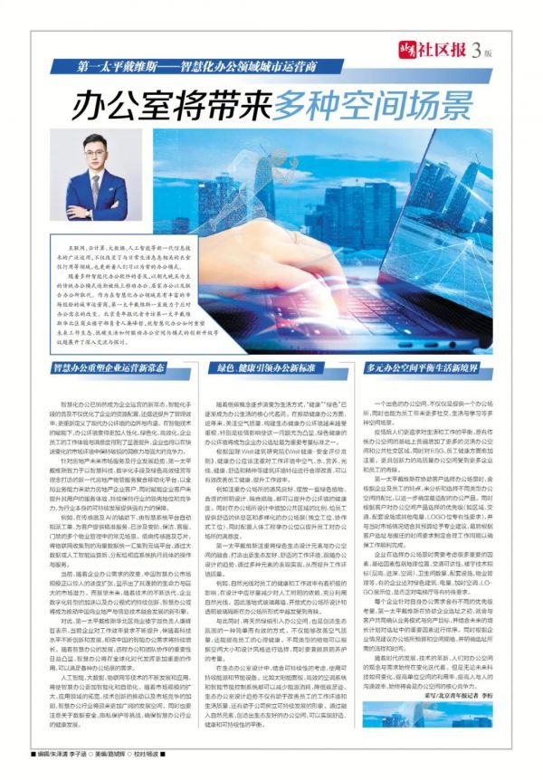 随着多种智能化办公软件的普及,以朝九晚五为主的传统办公模式逐渐被线上移动办公、居家办公以及联合办公所取代。作为在智慧化办公领域具有丰富的市场经验的城市运营商,第一太平戴维斯物业顾问(北京)有限公司一直致力于应对办公需求的改变。北京青年报记者专访第一太平戴维斯华北区商业楼宇部负责人廉峰哲,就智慧化办公如何重塑未来工作生态、低碳生活如何驱动办公空间与模式的创新升级等议题展开了深入交流与探讨。