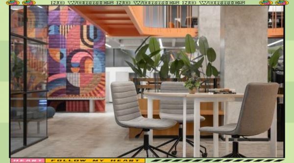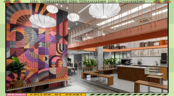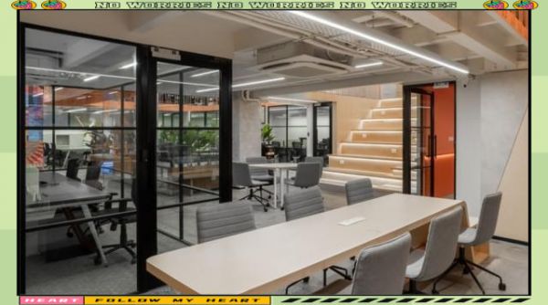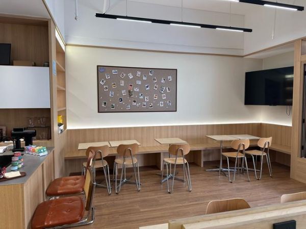 会议室巧妙地隐藏在涂鸦墙之后,推门而入,仿佛踏入了一个剧本杀的现场,脑洞大开的模式随即开启。而最令人惊艳的无疑是那个圆形小剧场,台阶上铺就的软垫让人在下午三点时瘫坐其上敲打电脑也显得分外惬意。隔壁组的脑暴会议声音,透过木格栅隐隐传来,如同背景白噪音,反而更增添了几分专注。