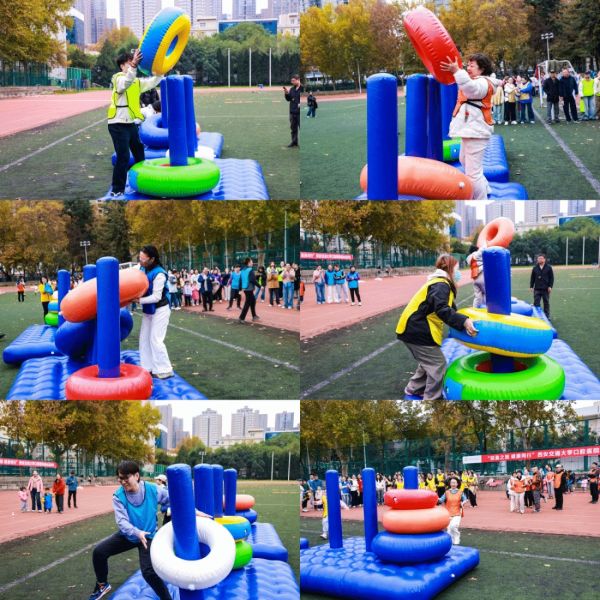 汉诺塔接力项目中,每队选手围绕着3个充气圈严阵以待。比赛开始,选手们迅速行动起来,严格遵循小压大和每次每人只能移动一块充气积木的规则,小心翼翼地将挑战区A柱上的充气积木向C柱挪动。大家分工明确,配合默契,每一次移动都经过深思熟虑。现场气氛紧张而热烈,选手们全神贯注,生怕出现一丝失误。