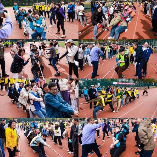 最后拔河比赛更是将现场气氛推向了高潮。每队队员紧紧握住拔河绳,双脚用力蹬地,身体向后倾斜,做好了全力拼搏的准备。比赛开始前,双方队员眼神中充满了斗志,互相较劲。裁判哨声一响,队员们齐声呐喊,齐心协力地往后拉。绳子中间的红绸在两队之间来回摆动,双方陷入了激烈的僵持。场边的观众们也都热血沸腾,纷纷为自己支持的队伍加油助威。