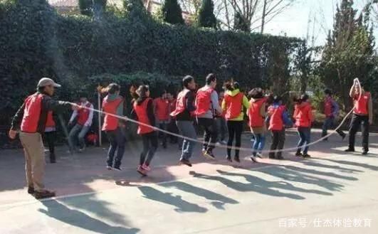 请两个人各握住绳子的一端,其他人要一起跳过绳子,所有人都跳过算一下,数一数整个团队总共能跳多少下。