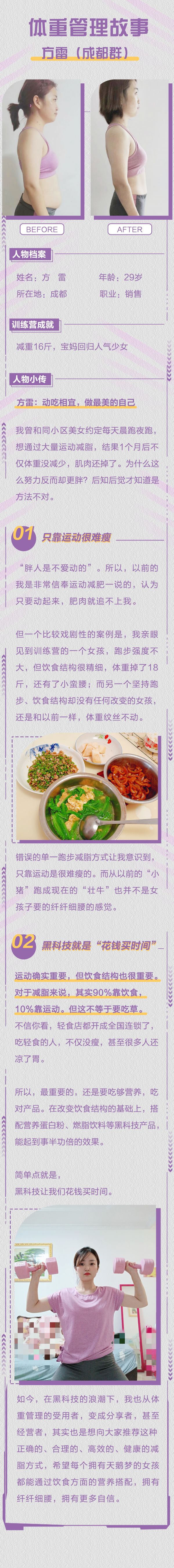 如今,在黑科技的浪潮下,我也从体重管理的受用者,变成分享者,甚至经营者,其实也是想向大家推荐这种正确的、合理的、高效的、健康的减脂方式,希望每个拥有天鹅梦的女孩都能通过饮食方面的营养搭配,拥有纤纤细腰,拥有更多自信。