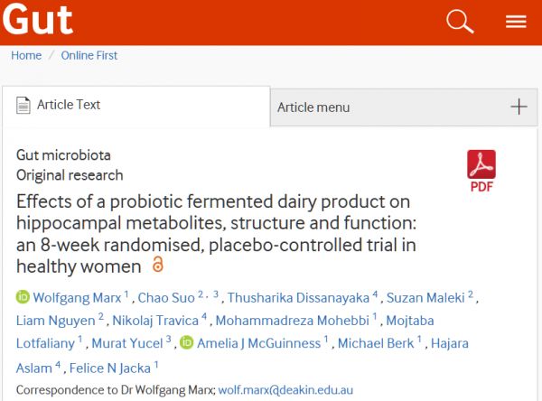 [1]Marx W, Suo C, Dissanayaka T, et al. Effects of a probiotic fermented dairy product on hippocampal metabolites, structure and function: an 8-week randomised, placebo-controlled trial in healthy women Gut Published Online First: 18 December 2025. doi: 10.1136/gutjnl-2025-335398