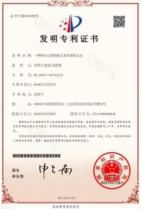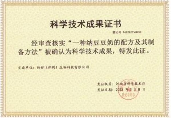 “纳奶”的核心竞争力源于其坚实的科技内核。产品以传统纳豆为基础,通过独特的菌种——枯草芽孢杆菌进行发酵,实现了植物蛋白的高效转化与营养升级。此项“一种纳豆豆奶的配方及其制备方法”已获得国家发明专利,并被正式收录于国家科技成果库,标志着该技术在科学性、创新性与应用价值上获得了国家级权威认可。