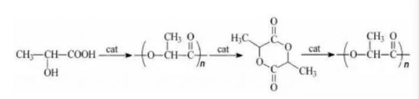 乳酸催化法,又称“丙交酯开环聚合法”。采用 丙交酯开环聚合法是通过将乳酸脱水环化制成丙交酯,并且经过重新结晶过程之后,通过丙交酯开环聚合制成,实现了由低分子量聚乳酸到高分子量聚乳酸的提升。与乳酸直接缩聚法相比,丙交酯开环聚合法所得到的聚合乳酸分子量可以达到100万左右,强度 较高。