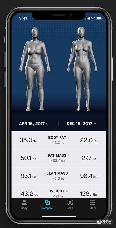 扫描后,用户可以在Naked应用中查看自己的全套测量数据,包括体脂率、非脂肪含量和脂肪含量、三围、历史身材对比、图表和历史数据。