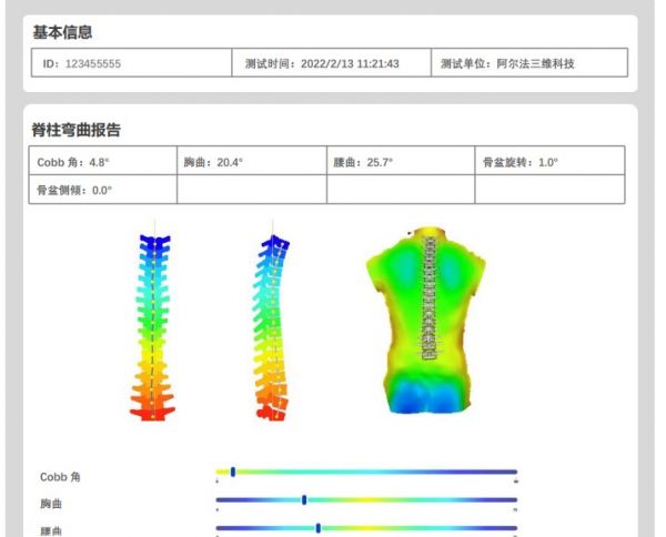 扫描过程不采集人体的面部信息,只采集背部的三维空间点云,并且以网格和色彩分布图的形式展示,充分尊重个人隐私。