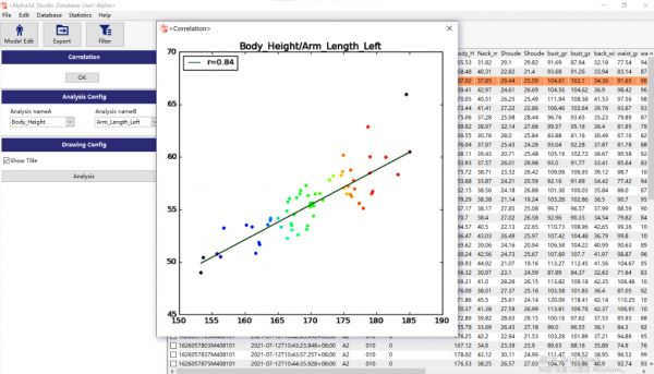 基于本地存储或者云端存储的人体数据库架构,用于保存和管理大量的原始3D模型、测量数据,与SIGMA -1扫描仪无缝连接。数据库支持多用户管理,支持对数据进行筛选、维护、查询、编辑以及批量输出功能,并提供了常用的数据统计分析工具和报表功能。