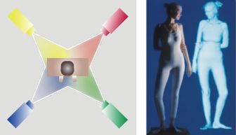 AlphaM4-MS 应用光学三角测量方法,高精度无接触地进行三维人体测量,扫描仪从被测人体的前左、前右、后左、后右四个方向进行同步扫描,从而生成360° 的人体图像模型。