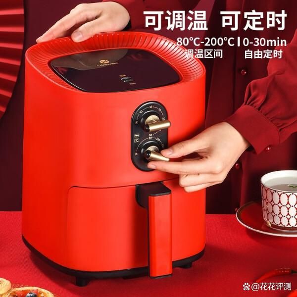 首先来说说这款空气炸锅的外观设计。利仁H-2的外观真的很漂亮,大红色的机身看起来非常喜庆,很适合新年的氛围。整体造型简洁大方,放在厨房里很有格调。机身不算太大,占地面积小,收纳起来也很方便。正面有两个旋钮,分别用来调节时间和温度,操作起来非常简单直观。底部还有防滑脚垫,使用时很稳当。