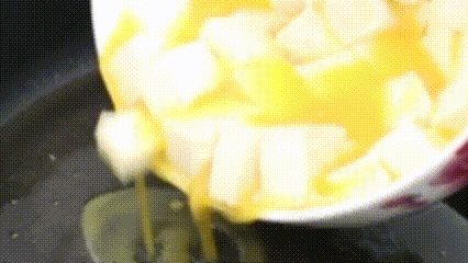 锅中倒入稍微多一点的油。开火油烧热,将鸡蛋豆腐倒进去,铺平先不要搅动,鸡蛋煎老一点也没关系,底部煎的发黄,煎出香味,翻过来再煎另一面,煎至豆腐有点微黄就可以了。关火盛出备用。